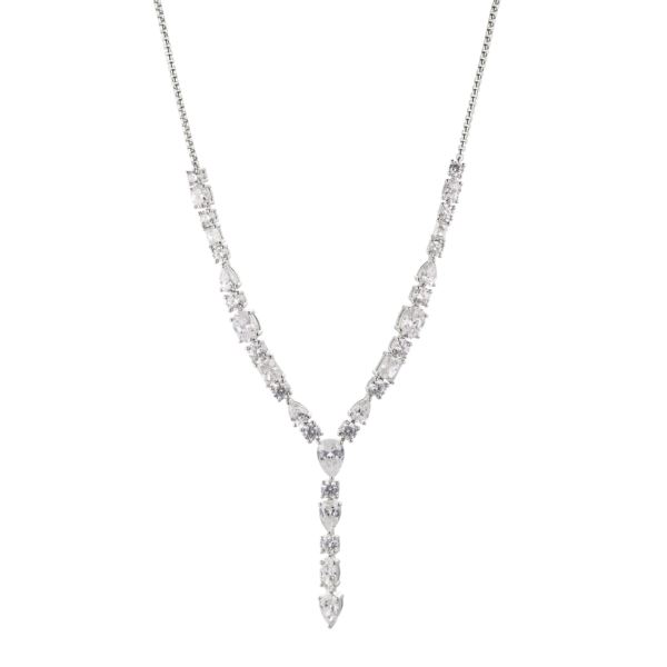 This RSVP necklace adds a glamorous touch to your look. A classic silhouette that will compliment any neckline. Features mixed Cubic Zirconia stones set in silver-tone brass. Measures 18" long with 2" extender.